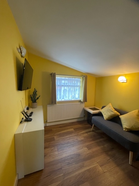 The property features a kitchenette equipped with a sink, microwave, and fridge (please note there is no washing machine). The living area is open plan and includes a small lounge space with a double chair, coffee table, and television.